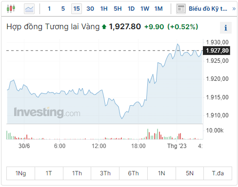 Vàng giao ngay trên sàn LBMA tăng 0,5% lên 1.917,94 USD/ounce và vàng kỳ hạn tháng 8/2023 trên sàn New York tăng 0,6% lên 1.929,4 USD/ounce, trên sàn Investing tăng 0,52% lên 1,927.08 USD/ounce.