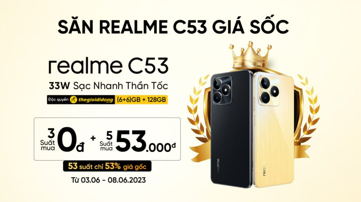 Realme C53 sẽ có giá 4,2 triệu đồng, khách hàng khi đặt mua điện thoại trên website Thế Giới Di Động có cơ hội trúng: 3 giải nhất mua realme C53 với giá 0đ; 5 giải nhì mua realme C53 với giá 53.000đ và 53 giải ba mua realme C53 với 53% giá gốc.