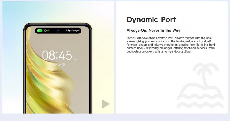 Smartphone này được cài sẵn hệ điều hành Android 13 với giao diện người dùng HiOS 13, mang tới tính năng Dynamic Port cho khả năng tương tác thú vị với phần lỗ đục trên màn hình.