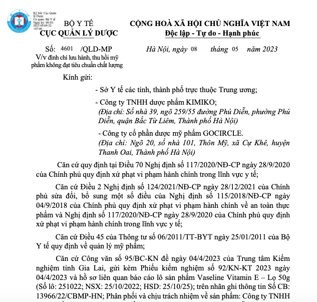 Theo đó, căn cứ Công văn số 95/BC-KN đề ngày 04/4/2023 của Trung tâm Kiểm nghiệm tỉnh Gia Lai, gửi kèm Phiếu kiểm nghiệm số 92/KN-KT 2023 ngày 04/4/2023 và hồ sơ liên quan báo cáo lô sản phẩm Vaseline Vitamin E – Lọ 50g (Số lô: 251022; NSX: 25/10/2022; HSD: 25/10/25); trên nhãn ghi thông tin Số CB: 13966/22/CBMP-HN; Phân phối và chịu trách nhiệm về sản phẩm: Công ty TNHH dược phẩm Kimiko (địa chỉ: số nhà 39, ngõ 259/55 đường Phú Diễn, phường Phú Diễn, quận Bắc Từ Liêm, Thành phố Hà Nội); Nhà sản xuất: Công ty cổ phần dược mỹ phẩm Gocircle (địa chỉ: Thôn Mỹ, xã Cự Khê, huyện Thanh Oai, Thành phố Hà Nội).
