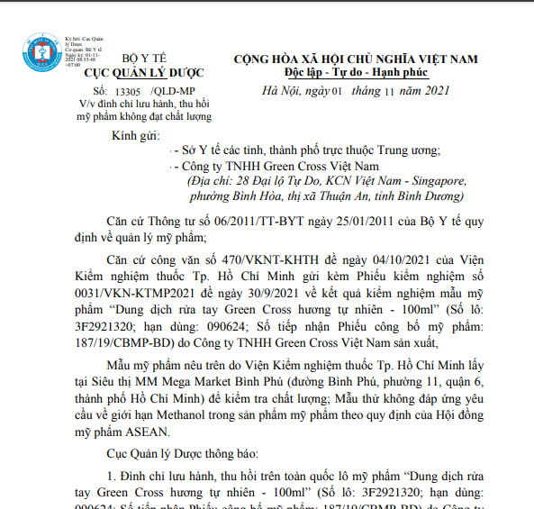 Theo đó, Cục Quản lý Dược (Bộ Y tế) đã đình chỉ lưu hành và thu hồi “Dung dịch rửa tay Green Cross hương tự nhiên-100ml” do không đáp ứng yêu cầu về giới hạn Methanol trong sản phẩm mỹ phẩm theo quy định của Hội đồng mỹ phẩm ASEAN.