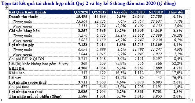 Lợi nhuận sau thuế hợp nhất Q2/2020 đạt 3.085 tỷ đồng, tăng 6,2% so với cùng kỳ 2019. Biên lợi nhuận ròng hợp nhất đạt 19,9%, bằng với cùng kỳ 2019 và thu nhập mỗi cổ phiếu đạt 1.586 đồng, tăng 5,7% so với cùng kỳ 2019.