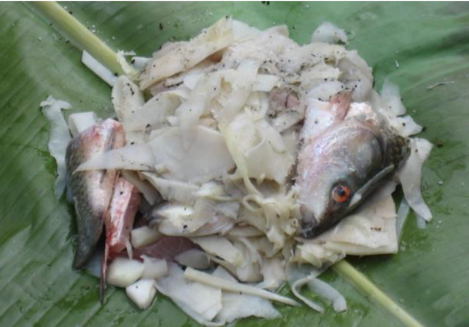 Sau đó tùy khẩu vị mà cá sẽ đem trộn với măng, rau táu (lá lốt rừng) thái nhỏ, hoa chuối rừng, lá đu đủ thái nhỏ, trộn thêm bột gạo.... rồi gói đùm vào lá chuối hoặc lá dong, đặt lên ốt đồ khoảng 10 - 12 tiếng.