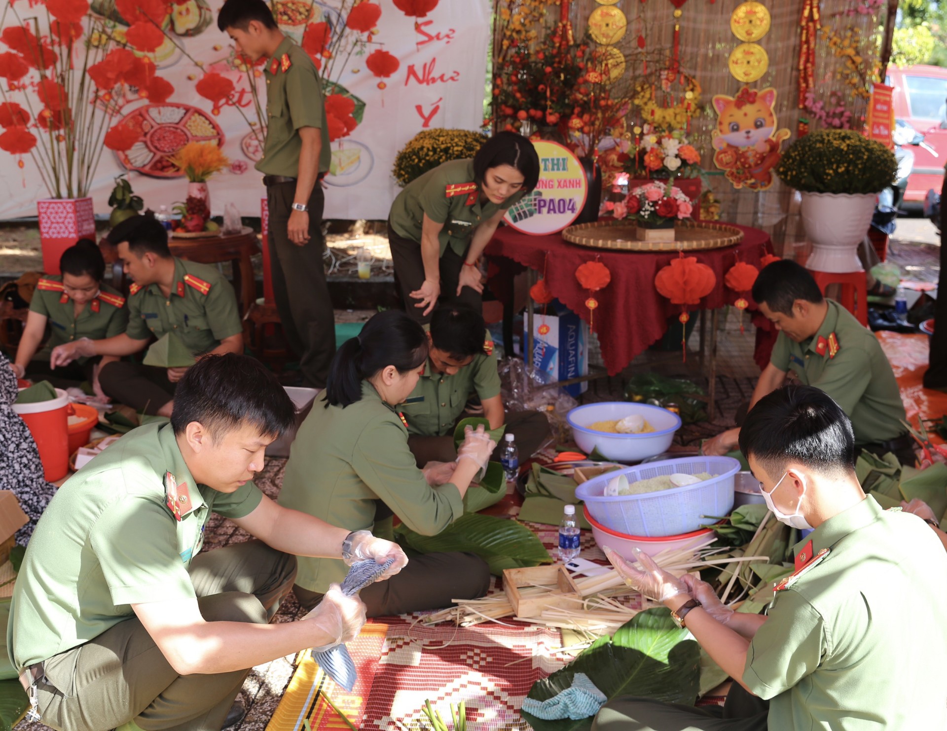 | Cá bộ chiến sĩ Công an tỉnh Đắk Nông hăng say với công việc làm bánh chưng tại Hội thi. |