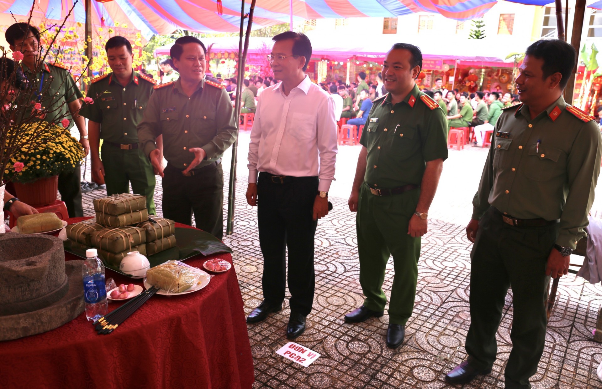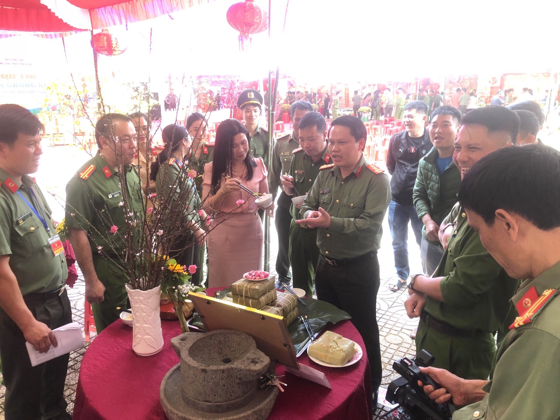 | Giám đốc Công an tỉnh Đắk Nông cùng các đại biểu tại Hội thi nấu bánh chưng xanh. |