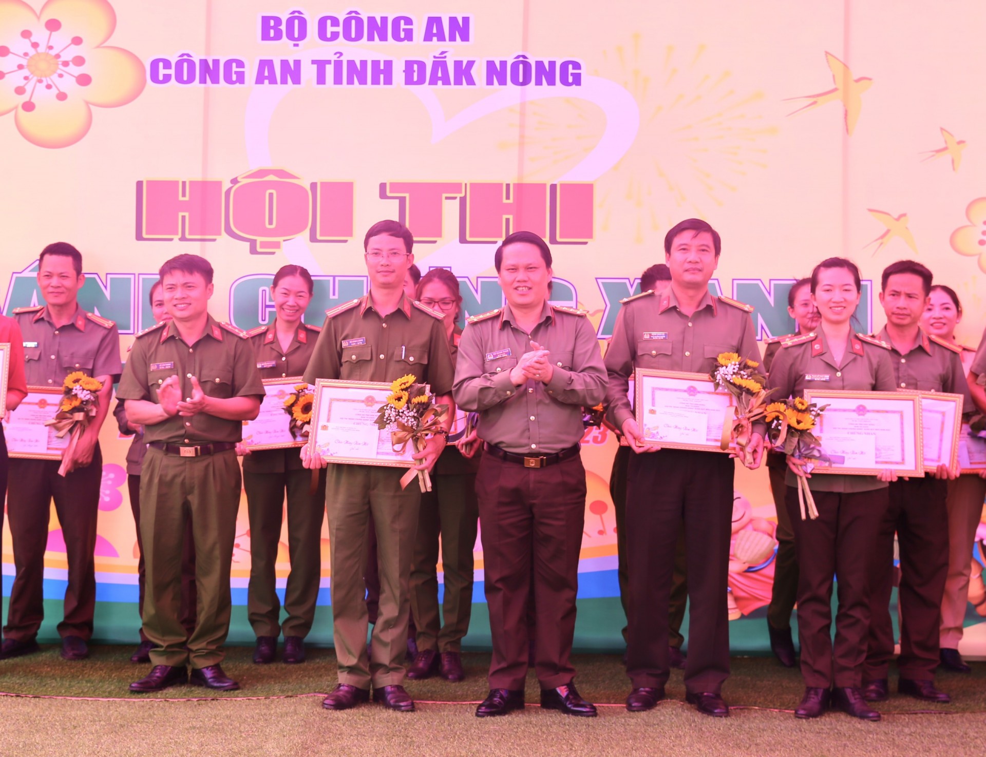 | Giám đốc Công an tỉnh Đắk Nông trao giải cho các đơn vị tham gia Hội thi nấu bánh chưng xanh dịp Tết Nguyên đán 2023. |