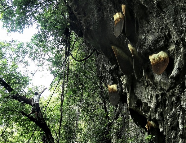 Để thu hoạch được sáp ong, người dân phải leo trên thang tự chế buộc chặt vào thân cây to gần vách đá rồi dùng sào tre có gắn thanh gỗ dẹt để chọc và cắt tổ ong.