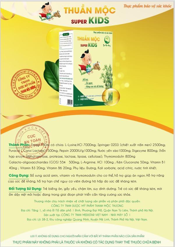 Sản phẩm THUẦN MỘC SUPER KIDS với công thức được nghiên cứu chuyên sâu, sử dụng nhiều nguyên liệu nhập khẩu từ Châu Âu và sản xuất tại nhà máy đạt chuẩn GMP trên dây truyền công nghệ hiện đại. Sản phẩm có nhiều nhóm hiệp đồng tác dụng như: nhóm kích thích ăn ngon, nhóm enzyme tiêu hóa, nhóm bổ sung axit amin, vitamin, kháng chất, nhóm bổ sung chất sơ. THUẦN MỘC SUPER KIDS là một sản phẩm hoàn toàn có thể sánh ngang hay còn là một đối thủ nặng ký với hàng loạt những sản phẩm nhập ngoại đang có trên thị trường hiện nay.