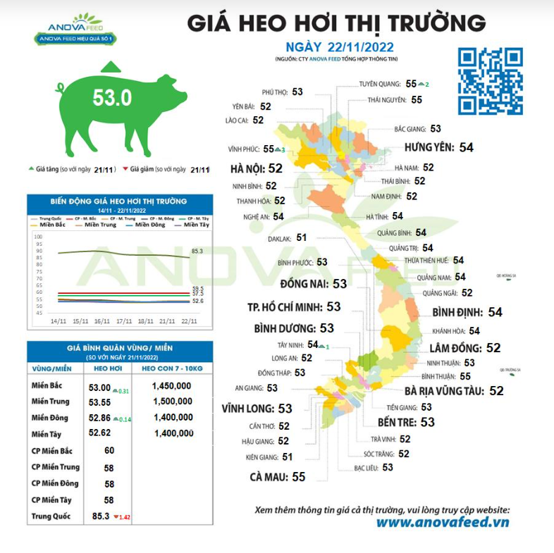 Các địa phương còn lại không thay đổi. Tại tỉnh Phú Thọ, Tuyên Quang, Bắc Giang giá heo hơi ở mức 53.000 đồng/kg.