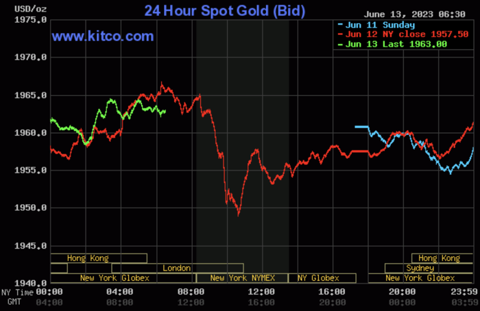 Trong phiên giao dịch chiều ngày 13/6, giá vàng giao ngay tăng 0,28% lên 1.963 USD/ounce vào lúc 17h31 (giờ Việt Nam), theo Kitco. Trong khi, giá vàng giao tháng 8 tăng 0,38% lên 1.977 USD/ounce.