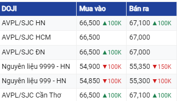 Cụ thể, tại Công ty Vàng bạc Đá quý Sài Gòn và Tập đoàn Doji, giá vàng SJC cùng tăng 100.000 đồng/lượng ở cả hai chiều mua vào - bán ra.