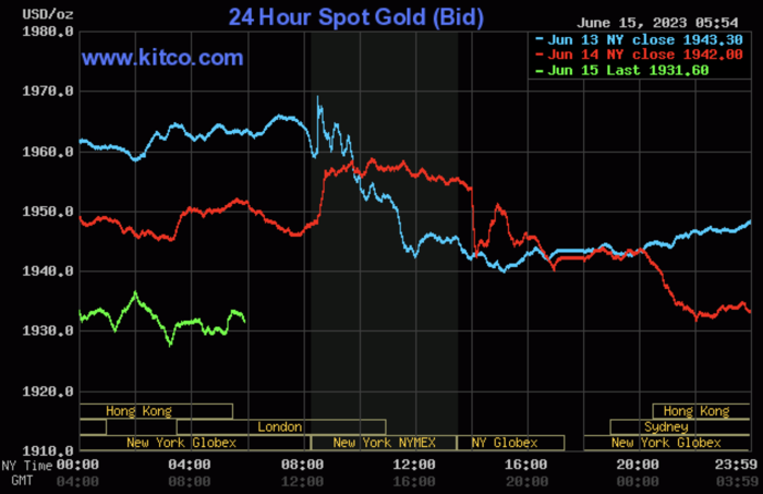 Trong phiên giao dịch chiều ngày 15/6, giá vàng giao ngay giảm 0,05% xuống 1.931 USD/ounce vào lúc 16h54 (giờ Việt Nam), theo Kitco. Trong khi, giá vàng giao tháng 8 giảm 1,14% xuống 1.946 USD/ounce.