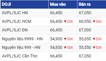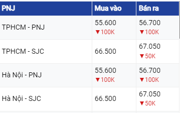 Tại hệ thống PNJ, giá vàng SJC tại TPHCM giữ nguyên ở chiều mua vào và giảm 50.000 đồng/lượng ở chiều bán ra, tương ứng với mức 66.6 triệu đồng/lượng và 67,05 triệu đồng/lượng.