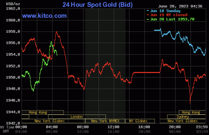 Trong phiên giao dịch chiều ngày 20/6, giá vàng giao ngay tăng 0,14% lên 1.953 USD/ounce vào lúc 16h23 (giờ Việt Nam), theo Kitco. Trong khi, giá vàng giao tháng 8 giảm 0,29% xuống 1.965 USD/ounce.