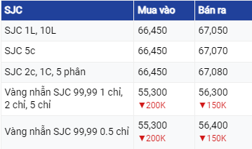 Toàn hệ thống của Công ty cổ phần vàng bạc đá quý Phú Nhuận SJC niêm yết giá vàng ở mức 66,45 - 66,95 triệu đồng/lượng, không đổi ở chiều mua vào và giảm 50,000 ở chiều bán ra.