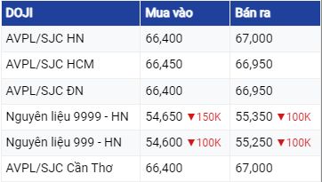 Vàng Doji HN niêm yết giá vàng ở mức 66,4 - 67 triệu đồng/lượng. Còn tại TPHCM Vàng Doji niêm yết giá vàng ở mức 66,45 - 66,95 triệu đồng/lượng. Vàng Doji ĐN niêm yết giá vàng ở mức 66,40 - 66,95 triệu đồng/lượng.