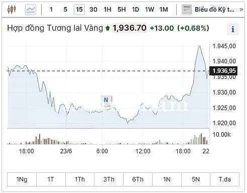 Trong phiên giao dịch chiều ngày 23/6, giá vàng giao ngay tăng 0,27% lên 1.919 USD/ounce vào lúc 21h57 (giờ Việt Nam). Trong khi, giá vàng giao tháng 8 tăng 0,68% lên 1.936 USD/ounce.