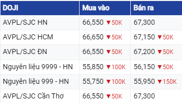 Tại Tập đoàn Doji, giá mua giảm 50.000 đồng/lượng xuống mức 66,55 triệu đồng/lượng nhưng giá bán không thay đổi, vẫn duy trì ở mức 67,3 triệu đồng/lượng.