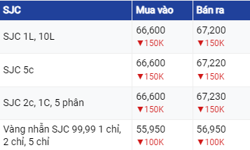 Cụ thể, giá mua - bán tại Công ty Vàng bạc Đá quý Sài Gòn đồng loạt giảm 150.000 đồng/lượng, xuống mức 66,6 triệu đồng/lượng và 67,2 - 67,22 triệu đồng/lượng.