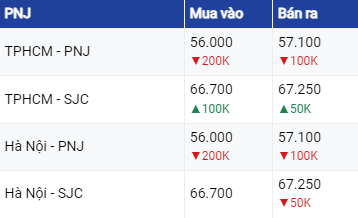 Còn tại Tập đoàn Phú Quý và hệ thống PNJ, điều chỉnh vàng SJC tăng 100.000 đồng/lượng ở chiều mua lên mức 66,70 triệu đồng/lượng và tăng 50.000 đồng/lượng ở chiều bán ra lên mức 66,25 triệu đồng/lượng.