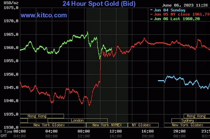 Trong phiên giao dịch chiều ngày 6/6, giá vàng giao ngay tăng 0,03% lên 1.962 USD/ounce vào lúc 17h04 (giờ Việt Nam), theo Kitco. Trong khi, giá vàng giao tháng 8 tăng 0,22% lên 1.978 USD/ounce.