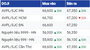 Trong khi đó, tại Tập đoàn Doji, giá vàng trong nước cuối phiên niêm yết ở mức 66,6 triệu đồng/lượng ở chiều mua và 67,35 triệu đồng/lượng ở chiều bán tăng 50,000 đồng/lượng ở cả hai phiên.