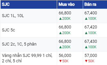 Theo ghi nhận, tại Công ty Vàng bạc Đá quý Sài Gòn, giá vàng SJC tăng 200.000 đồng/lượng ở chiều mua vào và tăng 100.000 đồng/lượng ở chiều bán ra, lần lượt đạt mức 66,8 triệu đồng/lượng và 67,4 - 67,42 triệu đồng/lượng.
