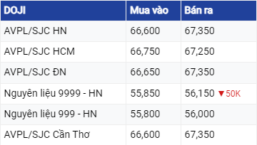 Cụ thể, tại Công ty Vàng bạc Đá quý Sài Gòn, giá vàng SJC giảm 50.000 đồng/lượng ở cả hai chiều mua vào và bán ra, lần lượt xuống mức 66,65 triệu đồng/lượng và 67,25 - 67,27 triệu đồng/lượng.