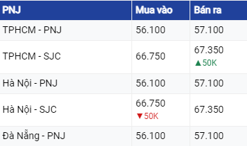 Trong khi đó, tại chi nhánh Hà Nội và TP HCM thuộc hệ thống PNJ, vàng SJC cùng giữ nguyên ở chiều mua, vẫn duy trì ở mức 66,75 triệu đồng/lượng còn chiều bán tăng 50.000 đồng/lượng lên mức 67,35 triệu đồng/lượng.