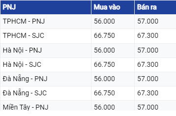 Vàng PNJ niêm yết giá vàng SJC ở mức 66,75 - 67,3 triệu đồng/lượng, giảm 50.000 đồng/lượng chiều bán ra và giữ nguyên ở chiều mua vào so với phiên liền trước.