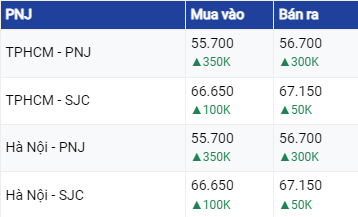 Tại hệ thống PNJ, giá vàng SJC ghi nhận mức tăng cao nhất 100.000 đồng/lượng ở chiều bán ra và tăng 50.000 đồng/lượng ở chiều mua vào.