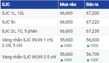 Công ty Vàng bạc Đá quý Sài Gòn đang niêm yết giá vàng SJC mua vào - bán ra ở mức 66,6 triệu đồng/lượng và 67,20 - 67,22 triệu đồng/lượng,giá vàng SJC vẫn đứng yên ở cả hai chiều mua vào và bán ra so với giá công bố trong phiên giao dịch sáng nay.