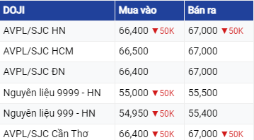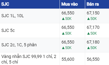 Giá vàng SJC ở khu vực Hà Nội và Đà Nẵng đang được mua vào mức 66,5 triệu đồng/lượng và bán ra mức 67,15 triệu đồng/lượng.