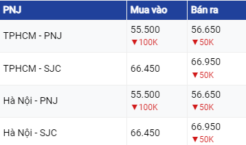 Vàng PNJ đang mua vào ở mức 66,45 triệu đồng/ lượng và bán ra mức 67 triệu đồng/lượng.