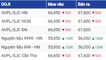 Tập đoàn Doji tiếp tục triển khai giá mua - bán với mức tương ứng là 66,85 triệu đồng/lượng và 67,6 triệu đồng/lượng, đồng thời giảm 50.000 đồng/lượng so với chốt phiên tuần liền kề.