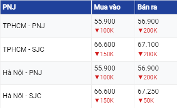 Trong đó, hệ thống PNJ điều chỉnh giá mua giảm 150.000 đồng/lượng, xuống mức 66,6 triệu đồng/lượng còn giá bán lại điều chỉnh giảm 200.000 đồng/lượng, xuống mức 67,1 triệu đồng/lượng.