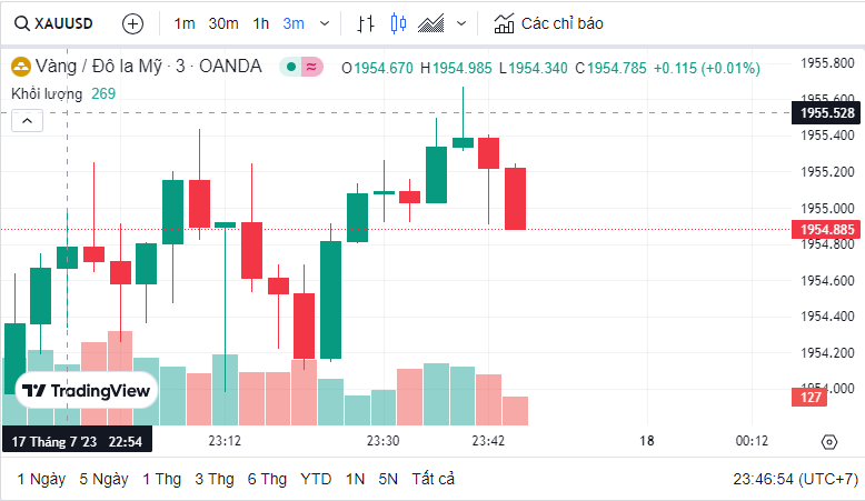 Giá vàng quốc tế (XAU) hôm nay là 1,955.14 USD (cập nhật lúc 23:45:53 17/07/2023).