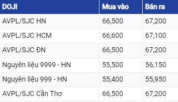 Trong khi đó, tại Tập đoàn Doji, giá vàng SJC niêm yết ở mức 66,50 triệu đồng/lượng mua vào và bán ra ở mức 67,20 triệu đồng/ lượng.