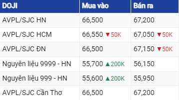 Trong khi đó, Tập đoàn Doji HN, giá vàng SJC niêm yết giá vàng ở mức 66,5 - 67,2 triệu đồng/lượng không thay đổi so với giá cập nhật đầu phiên hôm nay.
