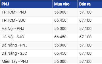 Vàng PNJ niêm yết giá vàng SJC ở mức 66,45 - 67,1 triệu đồng/lượng.