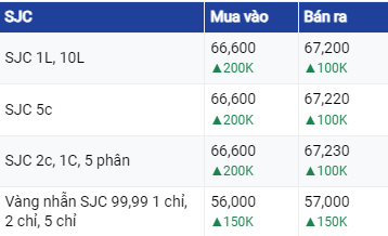 Cụ thể, tại Công ty Vàng bạc Đá quý Sài Gòn, giá vàng SJC tăng 200.000 đồng/lượng ở cả hai chiều mua và bán, lên mức 66,6 triệu đồng/lượng và 67,2 - 67,22 triệu đồng/lượng.