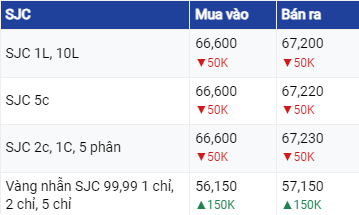 Tại Công ty Vàng bạc Đá quý Sài Gòn đang giao dịch chiều mua vào với giá là 66,60 triệu đồng/lượng và bán ra với giá là 67,20 - 67,22 triệu đồng/lượng.
