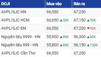 Trong khi đó, Tập đoàn Doji HCM, giá vàng SJC niêm yết giá vàng ở mức 66,55 - 67,15 triệu đồng/lượng tăng 50,000 đồng/lượt.