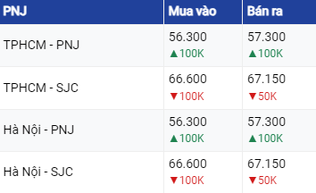Cụ thể, tại Công ty vàng bạc đá quý Sài Gòn, vàng SJC tăng 150.000 đồng/lượng ở cả chiều mua vào và chiều bán ra, giao dịch chiều mua vào với giá là 66,75 triệu đồng/lượng và bán ra với giá là 67,35 triệu đồng/lượng.