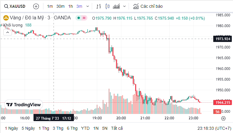 Giá vàng quốc tế (XAU) hôm nay là 1,944.80 USD (cập nhật lúc 23:17:03 27/07/2023).