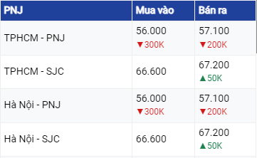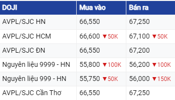 Riêng tại Tập đoàn Doji và Tập đoàn Phú Quý, giá vàng SJC tại khu vực Hà Nội và Đà Nẵng cuối phiên đều không thay đổi so với giá cập nhật sáng nay. Tại khu vực HCM cùng giảm 50,000 đồng/lượng niêm yết ở mức 66,6 triệu đồng/lượng ở chiều mua vào và 67,1 triệu đồng/lượng ở chiều bán ra.