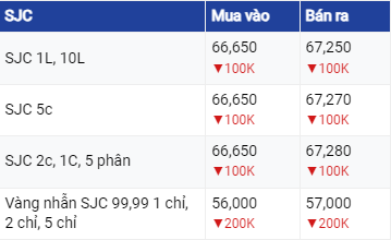 Theo ghi nhận, tại Công ty Vàng bạc Đá quý Sài Gòn, giá vàng cùng giảm 100.000 đồng/lượng ở cả hai chiều mua và bán, lần lượt xuống mức 66,65 triệu đồng/lượng và 67,25 - 67,27 triệu đồng/lượng.