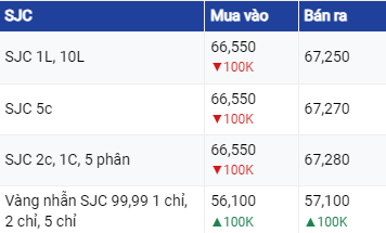 Tại hệ thống PNJ, vàng SJC đang giao dịch chiều mua vào với giá là 66,6 triệu đồng/lượng và bán ra với giá là 67,2 triệu đồng/lượng không đổi so với chốt phiên hôm qua.