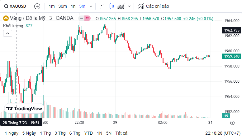 Giá vàng quốc tế (XAU) hôm nay là 1,959.25 USD (cập nhật lúc 22:16:54 30/07/2023).