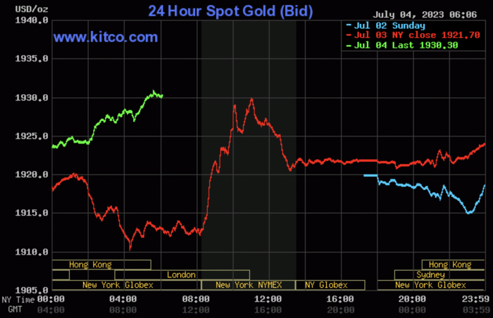 Trong phiên giao dịch chiều ngày 4/7, giá vàng giao ngay tăng 0,46% lên 1.930 USD/ounce vào lúc 17h08 (giờ Việt Nam), theo Kitco. Trong khi, giá vàng giao tháng 8 tăng 0,32% lên 1.937 USD/ounce.